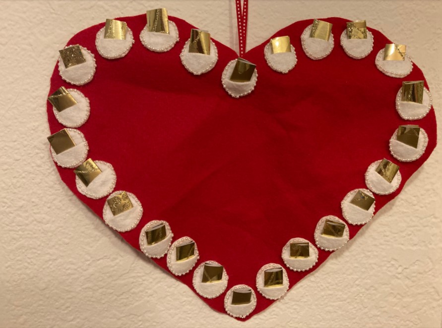 Thank you, Susan Lawrence, a speech therapist, in Los Angeles for this inspiration. Susan created her Hygge advent calendar by making a heart shaped wall hanging with pieces of gold paper, each one has a cozy activity written on it and placed in the pockets randomly.